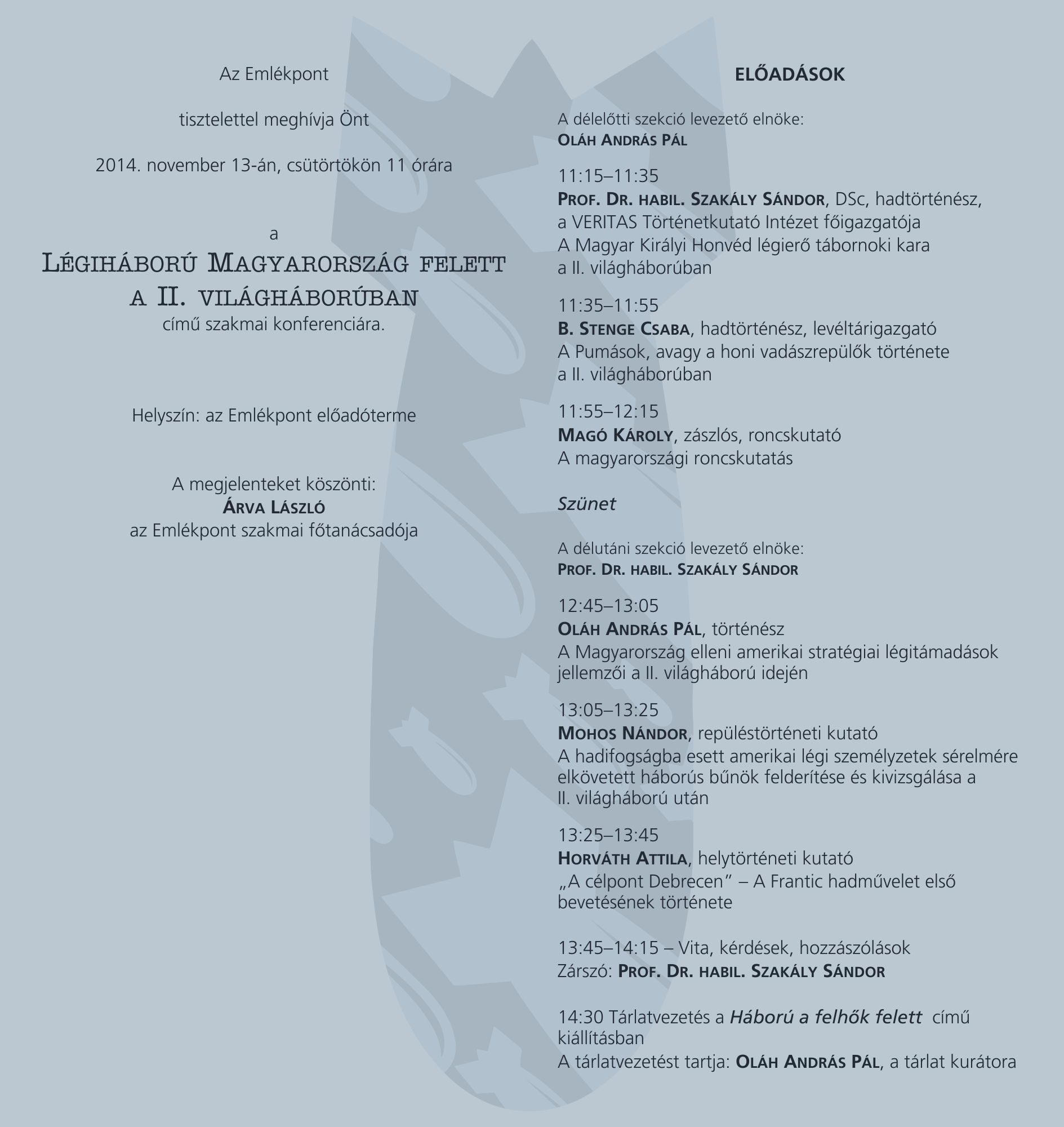 http://www.veritasintezet.hu/hu/esemenytar/299-legihaboru-magyarorszag-felett-a-ii-vilaghaboruban-szakmai-konferencia